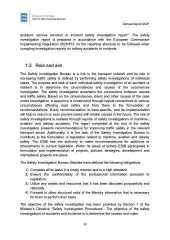The Safety Investigation Bureau is a link in the transport network and its role in increasing traffic safety is defined by performing safety investigations of individual cases. The purpose and task of each individual safety investigation of an accident or incident is to determine the circumstances and causes of the occurrences investigated. The safety investigation ascertains the connections between causes and traffic safety. Based on the circumstances, direct and other causes of the case under investigation, a sequence is constructed through logical connections to various circumstances affecting road safety and from there to the formulation of recommendations. Every recommendation is case-specific, and its implementation will help to reduce or even prevent cases with similar causes in the future. The role of safety investigations is realised through reports of safety investigations of maritime-, aviation- and railway accidents. The report completed at the end of the safety investigation presents recommendations for improving traffic safety in the relevant transport sector. Additionally, it is the task of the Safety Investigation Bureau to contribute to the formulation of legislation related to maritime, aviation and railway safety. The ESIB has the authority to make recommendations for additions or amendments to current legislation. Within its areas of activity ESIB participates in formulation and implementation of projects, policies, strategies, development and international projects and plans.