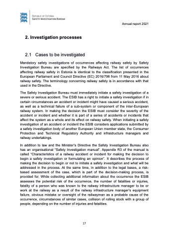 Mandatory safety investigations of occurrences affecting railway safety by Safety Investigation Bureau are specified by the Railways Act. The list of occurrences affecting railway safety in Estonia is identical to the classification presented in the European Parliament and Council Directive (EC) 2016/798 from 11 May 2016 about railway safety. The terminology concerning railway safety is in accordance with that used in the Directive.