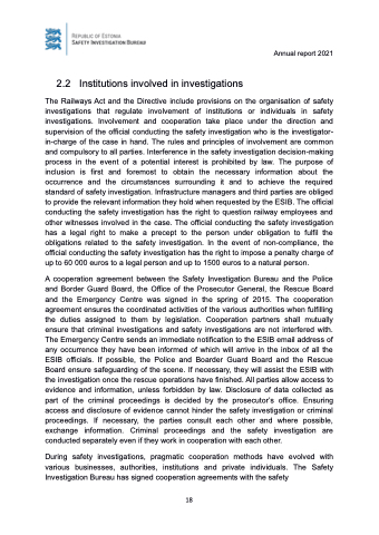 The Railways Act and the Directive include provisions on the organisation of safety investigations that regulate involvement of institutions or individuals in safety investigations. Involvement and cooperation take place under the direction and supervision of the official conducting the safety investigation who is the investigator- in-charge of the case in hand. The rules and principles of involvement are common and compulsory to all parties. Interference in the safety investigation decision-making process in the event of a potential interest is prohibited by law. The purpose of inclusion is first and foremost to obtain the necessary information about the occurrence and the circumstances surrounding it and to achieve the required standard of safety investigation. Infrastructure managers and third parties are obliged to provide the relevant information they hold when requested by the ESIB. The official conducting the safety investigation has the right to question railway employees and other witnesses involved in the case. The official conducting the safety investigation has a legal right to make a precept to the person under obligation to fulfil the obligations related to the safety investigation. In the event of non-compliance, the official conducting the safety investigation has the right to impose a penalty charge of up to 60 000 euros to a legal person and up to 1500 euros to a natural person.