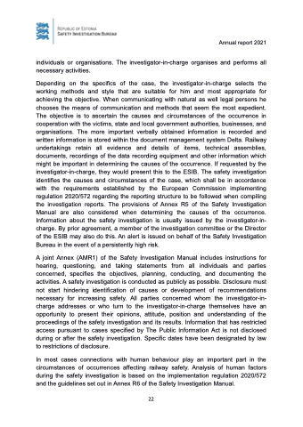 Depending on the specifics of the case, the investigator-in-charge selects the working methods and style that are suitable for him and most appropriate for achieving the objective. When communicating with natural as well legal persons he chooses the means of communication and methods that seem the most expedient. The objective is to ascertain the causes and circumstances of the occurrence in cooperation with the victims, state and local government authorities, businesses, and organisations. The more important verbally obtained information is recorded and written information is stored within the document management system Delta. Railway undertakings retain all evidence and details of items, technical assemblies, documents, recordings of the data recording equipment and other information which might be important in determining the causes of the occurrence. If requested by the investigator-in-charge, they would present this to the ESIB. The safety investigation identifies the causes and circumstances of the case, which shall be in accordance with the requirements established by the European Commission implementing regulation 2020/572 regarding the reporting structure to be followed when compiling the investigation reports. The provisions of Annex R5 of the Safety Investigation Manual are also considered when determining the causes of the occurrence. Information about the safety investigation is usually issued by the investigator-in- charge. By prior agreement, a member of the investigation committee or the Director of the ESIB may also do this. An alert is issued on behalf of the Safety Investigation Bureau in the event of a persistently high risk.