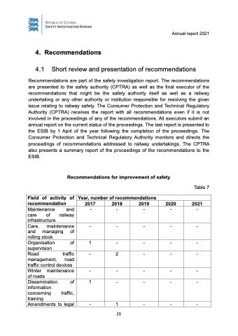Recommendations are part of the safety investigation report. The recommendations are presented to the safety authority (CPTRA) as well as the final executor of the recommendations that might be the safety authority itself as well as a railway undertaking or any other authority or institution responsible for resolving the given issue relating to railway safety. The Consumer Protection and Technical Regulatory Authority (CPTRA) receives the report with all recommendations even if it is not involved in the proceedings of any of the recommendations. All executors submit an annual report on the current status of the proceedings. The last report is presented to the ESIB by 1 April of the year following the completion of the proceedings. The Consumer Protection and Technical Regulatory Authority monitors and directs the proceedings of recommendations addressed to railway undertakings. The CPTRA also presents a summary report of the proceedings of the recommendations to the ESIB.