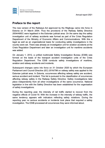 On January 1, 2012, a unified multimodal Safety Investigation Bureau (ESIB) was formed on the basis of the transport accident investigation units of the Crisis Regulation Department. The ESIB conducts safety investigations of maritime, aviation and railway accidents and incidents.