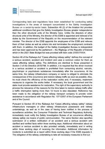 Pursuant to Section 49 of the Railways Act “Cases affecting railway safety” railway infrastructure managers or other railway infrastructure possessors and railway undertakings, as well as in the case of having been notified in the process of surveillance activities, the Consumer Protection and Technical Regulatory Authority, immediately must notify the Safety Investigation Bureau of an occurrence affecting railway safety via means of public communication. The same Section also specifies submission of a written notification of an accident and a serious accident with clarified and verified facts within three working days. Additional information about an accident or serious accident is also provided verbally, immediately and in writing within three working days of receiving the information. Additional information for incidents is submitted as a report within three working days if the ESIB requests it. The obligation of the railway undertaking to take all necessary measures to find out