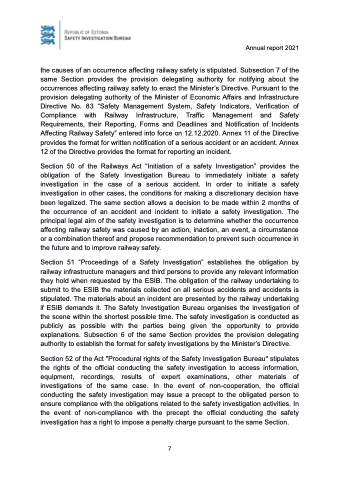 the causes of an occurrence affecting railway safety is stipulated. Subsection 7 of the same Section provides the provision delegating authority for notifying about the occurrences affecting railway safety to enact the Minister’s Directive. Pursuant to the provision delegating authority of the Minister of Economic Affairs and Infrastructure Directive No. 83 “Safety Management System, Safety Indicators, Verification of Compliance with Railway Infrastructure, Traffic Management and Safety Requirements, their Reporting, Forms and Deadlines and Notification of Incidents Affecting Railway Safety” entered into force on 12.12.2020. Annex 11 of the Directive provides the format for written notification of a serious accident or an accident. Annex 12 of the Directive provides the format for reporting an incident.