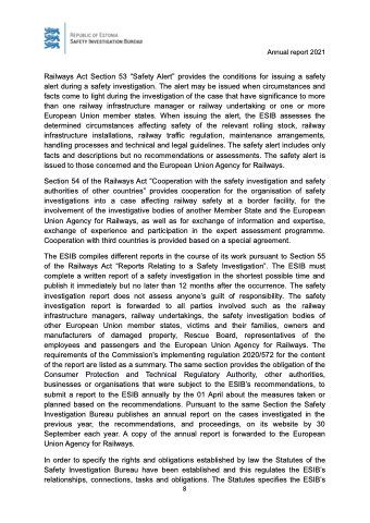 The ESIB compiles different reports in the course of its work pursuant to Section 55 of the Railways Act “Reports Relating to a Safety Investigation”. The ESIB must complete a written report of a safety investigation in the shortest possible time and publish it immediately but no later than 12 months after the occurrence. The safety investigation report does not assess anyone’s guilt of responsibility. The safety investigation report is forwarded to all parties involved such as the railway infrastructure managers, railway undertakings, the safety investigation bodies of other European Union member states, victims and their families, owners and manufacturers of damaged property, Rescue Board, representatives of the employees and passengers and the European Union Agency for Railways. The requirements of the Commission's implementing regulation 2020/572 for the content of the report are listed as a summary. The same section provides the obligation of the Consumer Protection and Technical Regulatory Authority, other authorities, businesses or organisations that were subject to the ESIB’s recommendations, to submit a report to the ESIB annually by the 01 April about the measures taken or planned based on the recommendations. Pursuant to the same Section the Safety Investigation Bureau publishes an annual report on the cases investigated in the previous year, the recommendations, and proceedings, on its website by 30 September each year. A copy of the annual report is forwarded to the European Union Agency for Railways.
