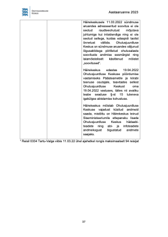 Häirekeskusele 11.03.2022 sündmuse aruandes adresseeritud soovitus ei ole seotud raudteeohutust mõjutava juhtumiga kui intsidendiga ning ei ole seotud sellega, kuidas edaspidi taolist õnnetust vältida. Ohutusjuurdluse Keskus on sündmuse aruandes väljunud õigusaktidega piiritletud ohutusalaste soovituste andmise eesmärgist ning laiamõisteliselt käsitlenud mõistet „soovitused“.
